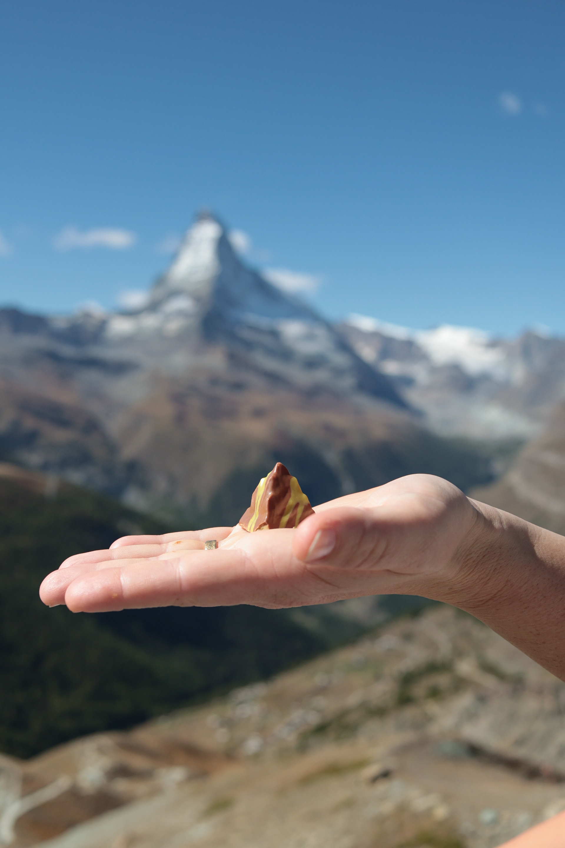 Toblerone-Model, Touristen-Attraktion und Liebling der Schweizer Alpen, - das Matterhorn, von den Wallisern liebevoll "Horu" genannt, strahlt an diesem Samstag in voller Pracht. Wir lassen uns mit dem Touristen-Strom treiben und können es nicht lassen, ebenfalls die Matterhorn-Pralinen zu testen (Dubai-Style nicht zu empfehlen ;)).